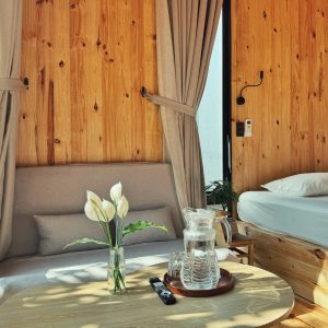 Bungalow có 2 tầng rộng rãi, bố trí 2 giường đôi và 1 giường sofa, phù hợp cho gia đình hoặc nhóm bạn muốn tận hưởng không gian riêng tư, ấm cúng nhưng vẫn gần gũi với thiên nhiên. Tầng trên mang lại cảm giác yên tĩnh, trong khi tầng dưới là không gian sinh hoạt chung thoải mái, lý tưởng cho những buổi nghỉ ngơi chậm rãi.